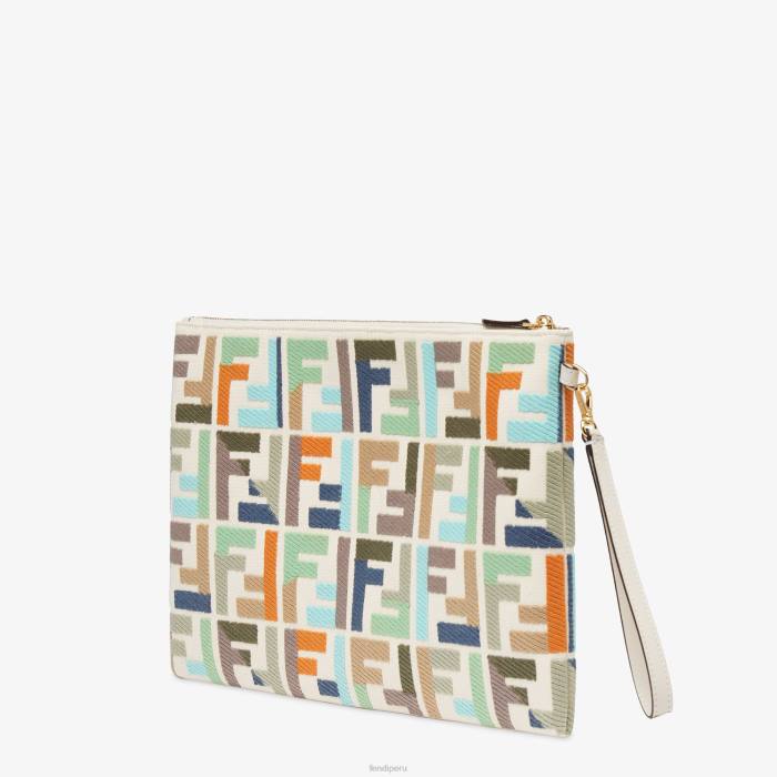 Bolsa grande con asa de pulsera extraíble. cierre de cremallera. Confección en lona blanca con bordado ff multicolor. artículos de metal con acabado dorado.