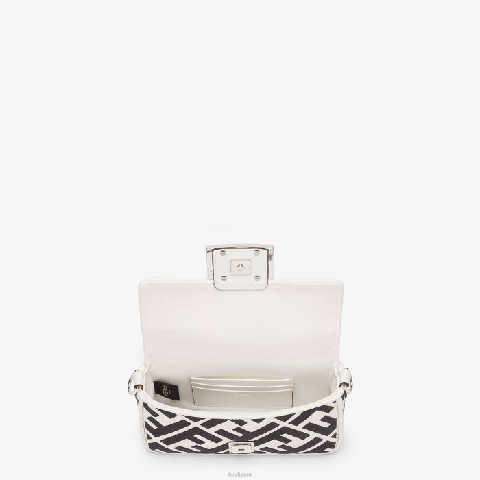 icónico bolso mini baguette, confeccionado en lona blanca con motivo ff negro bordado en relieve y cierre ff decorativo.