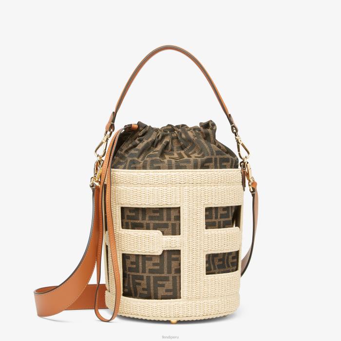 Bolso bombonera confeccionado en paja de color natural tejida con efecto punto arroz para crear las letras fendi. Bolsa interna fija de tejido jacquard con motivo ff marrón.