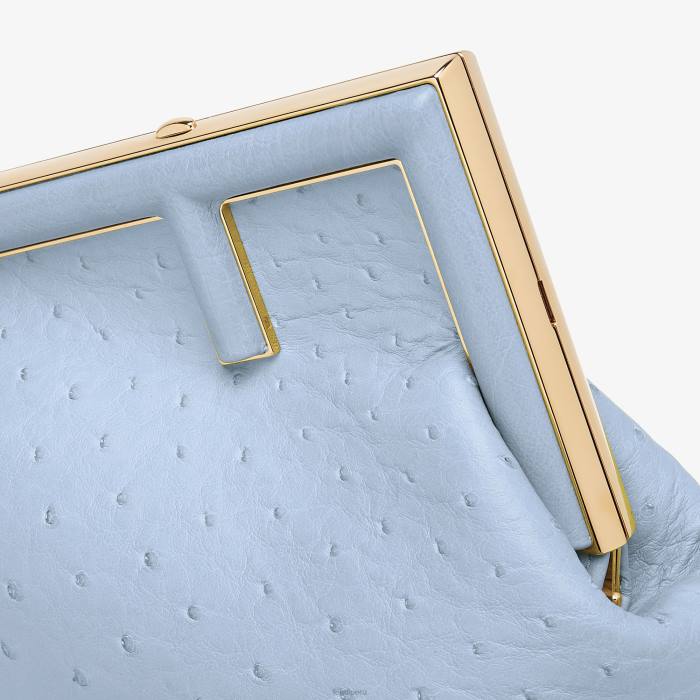 Primer bolso pequeño de Fendi confeccionado en exquisita piel de avestruz de color azul claro con cierre en forma de F de metal extragrande encuadernado en piel de napa tono sobre tono.