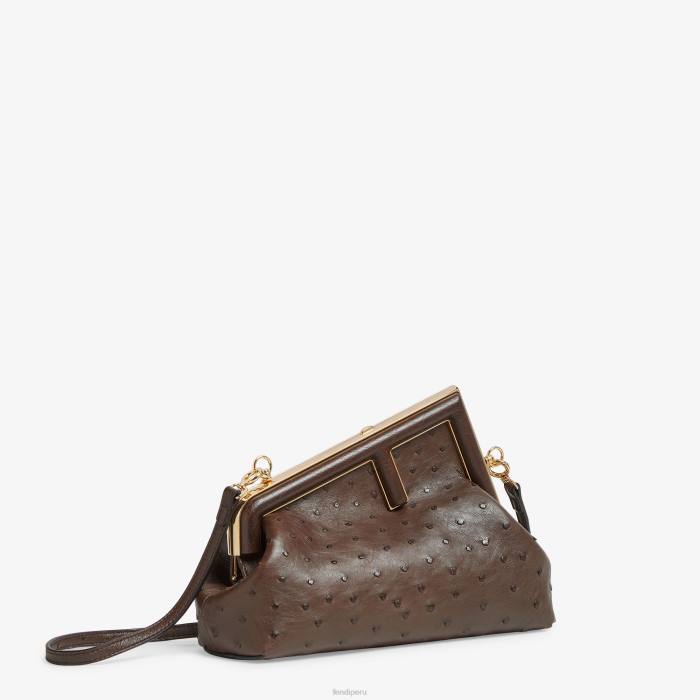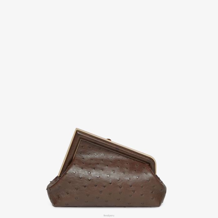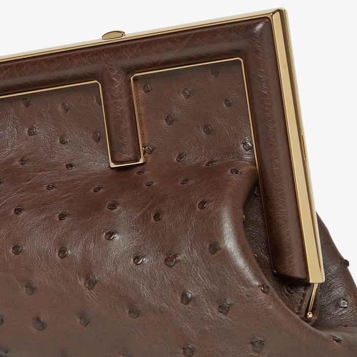 Primer bolso pequeño de Fendi confeccionado en exquisita piel de avestruz de color marrón oscuro con cierre en forma de F de metal de gran tamaño ribeteado en piel de napa tono sobre tono.