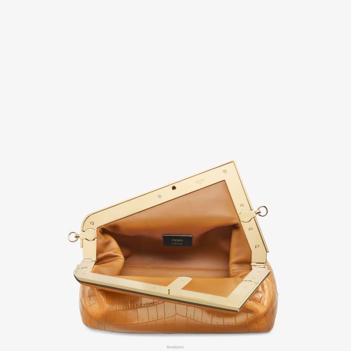 Primer bolso Fendi del tamaño perfecto para el día, confeccionado en exquisita piel de cocodrilo marrón con cierre en forma de F de metal de gran tamaño ribeteado en cocodrilo tono sobre tono.
