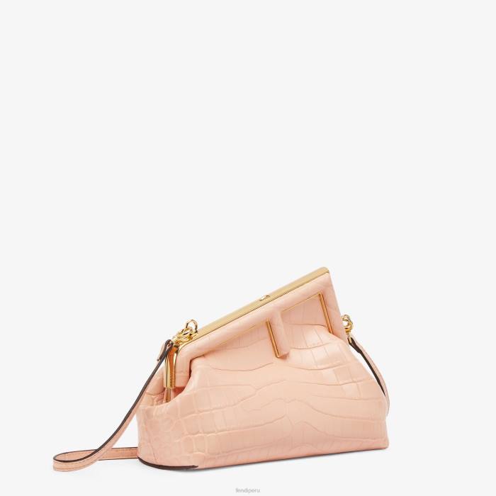 Primer bolso pequeño de Fendi confeccionado en exquisita piel de cocodrilo de color rosa claro con cierre en forma de F de metal de gran tamaño encuadernado en piel de cocodrilo tono sobre tono.