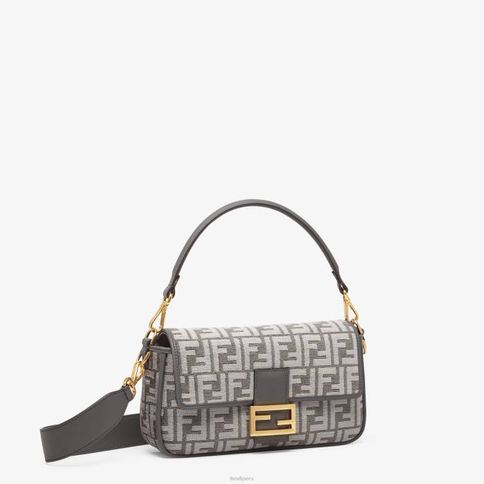 icónico bolso baguette mediano confeccionado en chenilla con motivo tapiz ff gris oscuro. acabado con detalles de cuero tono sobre tono y adornado con un cierre ff.