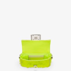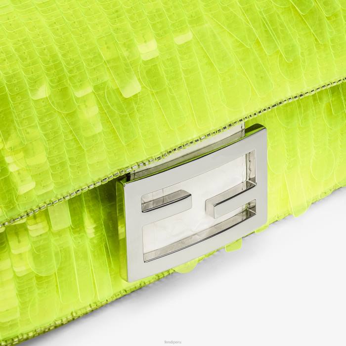 Icónico bolso mini baguette bordado íntegramente con lentejuelas transparentes de color amarillo neón de diferentes formas y tamaños. decorado con un cierre ff.