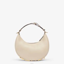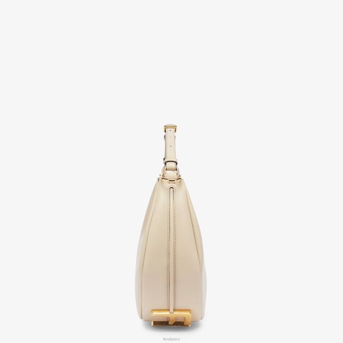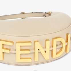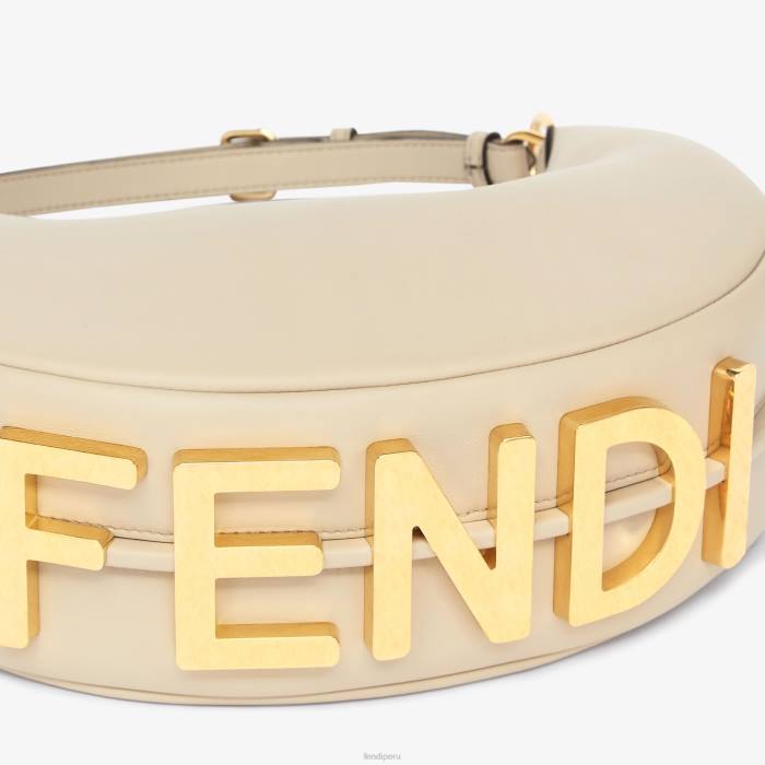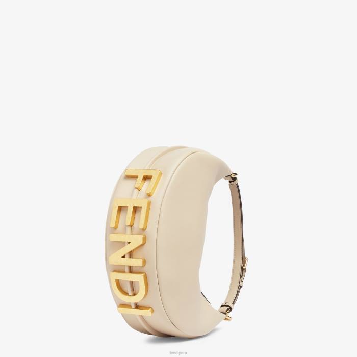 Bolso hobo pequeño confeccionado en suave piel beige, decorado con letras vintage de Fendi en metal dorado visibles al llevar el bolso debajo del brazo.