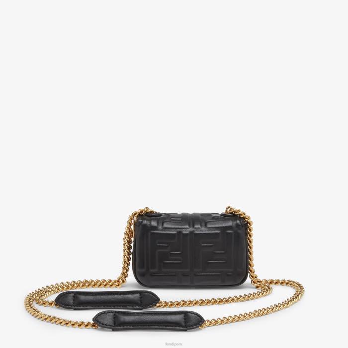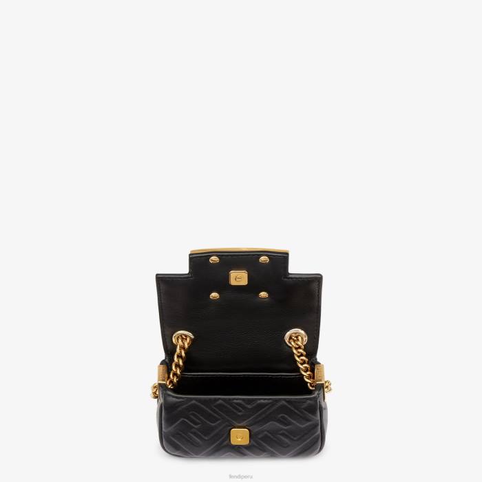 Versión nano del icónico bolso baguette, con solapa, asa y cierre ff con cierre magnético. Se puede llevar en la mano o cruzado gracias a la correa para el hombro con cadena deslizante. Tarjetero con bolsillo plano en el interior. Realizado en napa negra con motivo ff grabado. artículos de metal con acabado dorado.