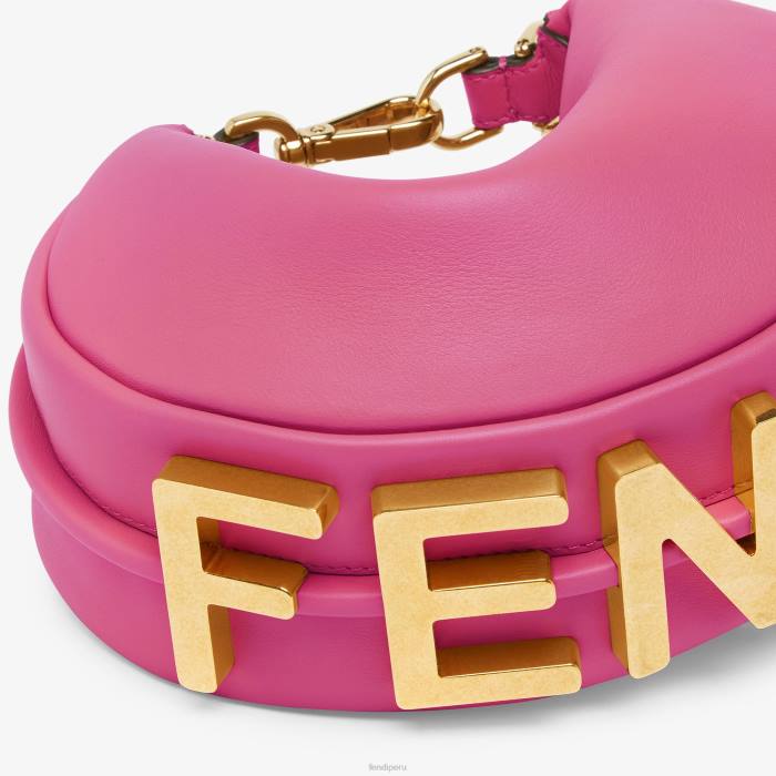 Mini bolso hobo confeccionado en suave piel fucsia, adornado con letras fendi vintage de metal dorado.