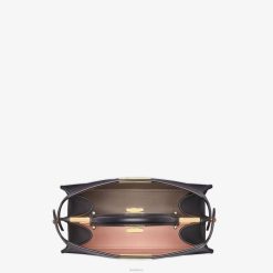 con forro de suave napa bicolor rosa y gris tórtola, dos compartimentos separados por una partición rígida, un bolsillo interior con botón y detalles metálicos con acabado dorado.