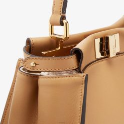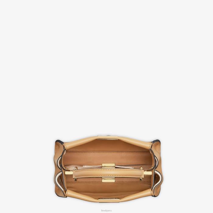 icónico bolso peekaboo, tamaño pequeño, confeccionado en piel color miel y adornado con el clásico cierre giratorio en ambos lados.