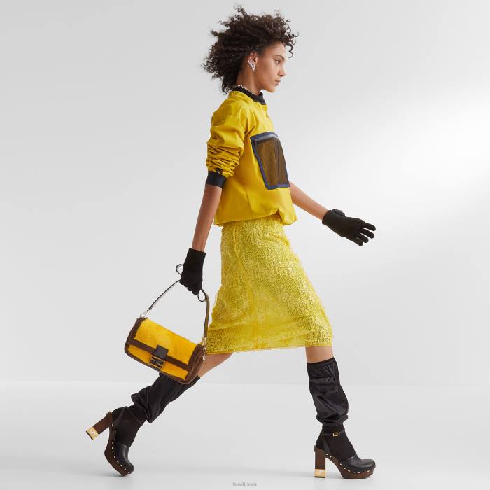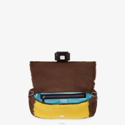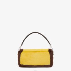 el baguette #22 está inspirado en el baguette con “incrustaciones de piel de visón” del otoño/ Colección invierno 1999-2000. el bolso está hecho a mano con incrustaciones de piel de oveja amarilla y marrón oscuro y está adornado con detalles.