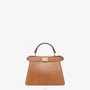 icónico bolso peekaboo iseeu pequeño, confeccionado en piel cuoio romano marrón, rematado a mano con pespuntes tono sobre tono y el clásico cierre de giro en ambos lados.