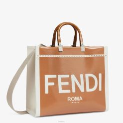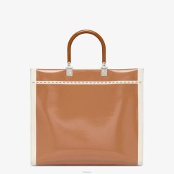 Bolso shopper mediano Sunshine confeccionado en charol marrón, con letras fendi roma grabadas que dejan al descubierto la base de lona natural. asas rígidas de plexiglás marrón.