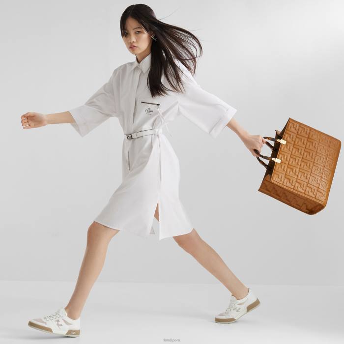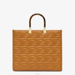 Bolso shopper mediano Sunshine confeccionado en piel marrón con motivo ff con textura 3D en relieve y asas rígidas de plexiglás efecto carey.
