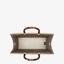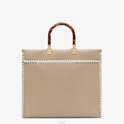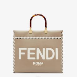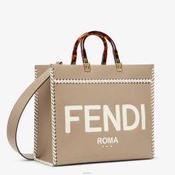 Shopper mediano Sunshine confeccionado en piel gris tórtola, con hilos de cuero y letras fendi roma blancas estampadas en caliente. asas rígidas de plexiglás con efecto carey.