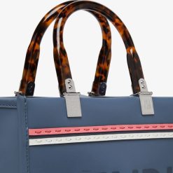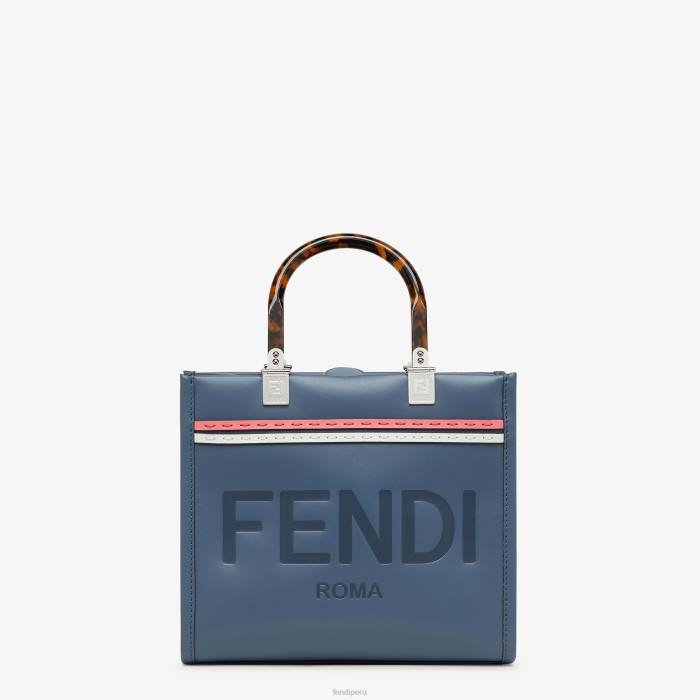 Bolso shopper pequeño Sunshine confeccionado en piel azul con inscripción Fendi Roma estampada en caliente y asas rígidas de plexiglás en carey.