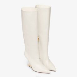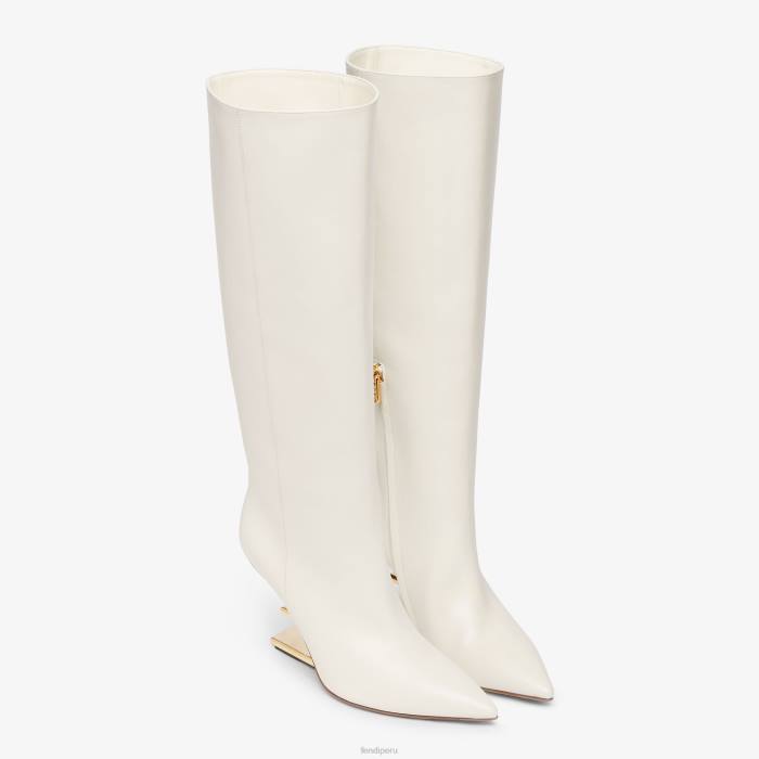 Primeras botas fendi con puntera puntiaguda y cremallera lateral en el interior con tirador de cremallera fendi o’lock. fabricado en cuero blanco. Tacón esculpido en forma de F diagonal de metal dorado.