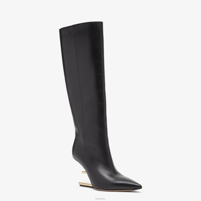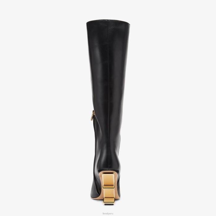 Primeras botas fendi con puntera puntiaguda y cremallera lateral en el interior con tirador de cremallera fendi o’lock. fabricado en cuero negro. Tacón esculpido en forma de F diagonal de metal dorado.