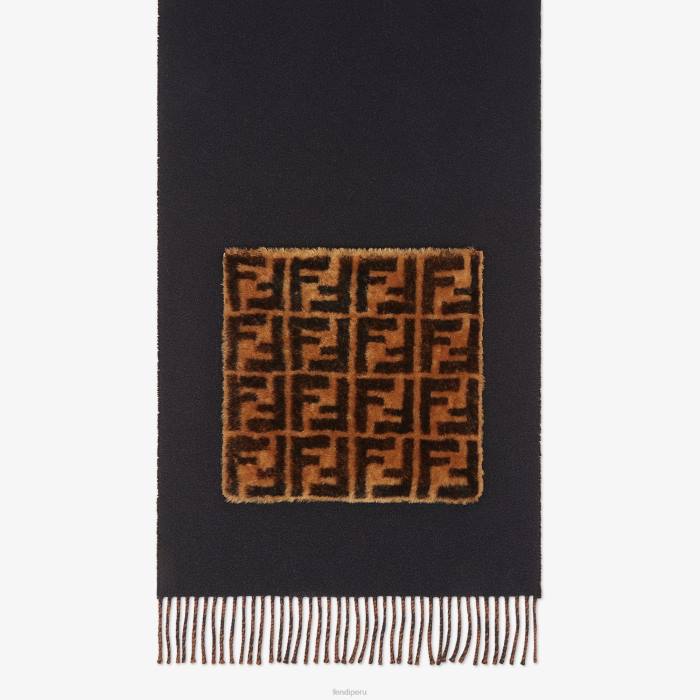 Bufanda confeccionada en una exquisita mezcla de lana y cashmere de color negro. Apliques de borreguito con estampado macro ff. el interior de colores contrastantes añade un toque de sofisticación a la apariencia y combina con la paleta de colores de la colección.
