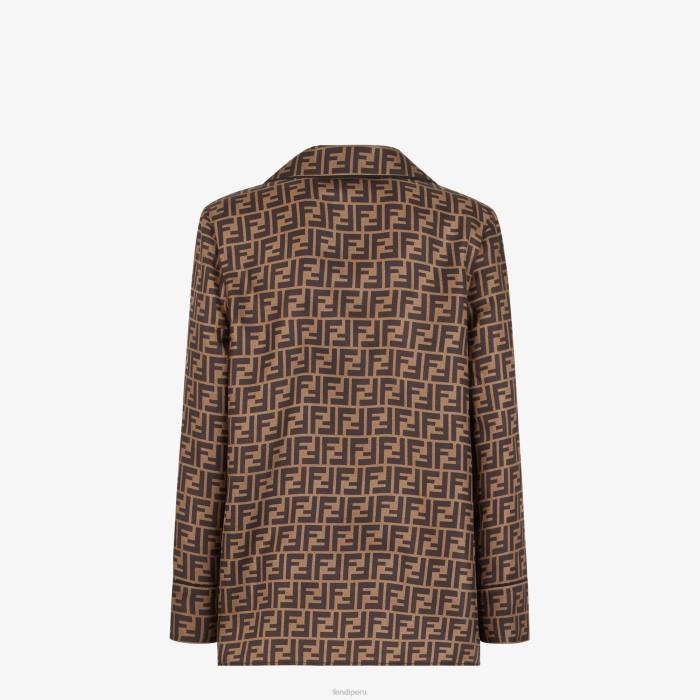 Camisa fluida de manga larga. Confección en sarga de seda marrón con estampado del motivo ff por toda la prenda. bolsillo en el pecho bordado con letras fendi negras.