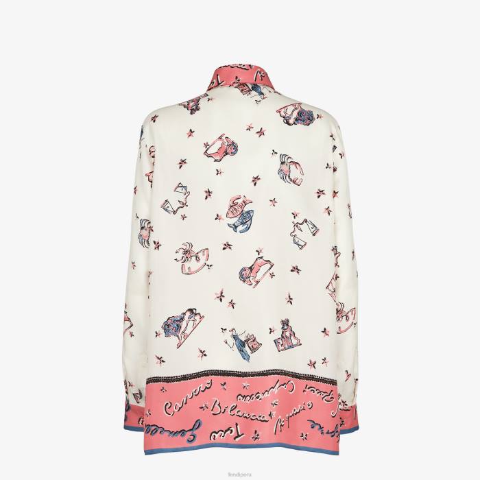 Camisa larga con botones ocultos. las mangas cuentan con puños anchos y tachuelas para gemelos. confección en sarga de seda con estampado astrológico Fendi en toda la prenda en blanco y rosa.