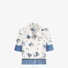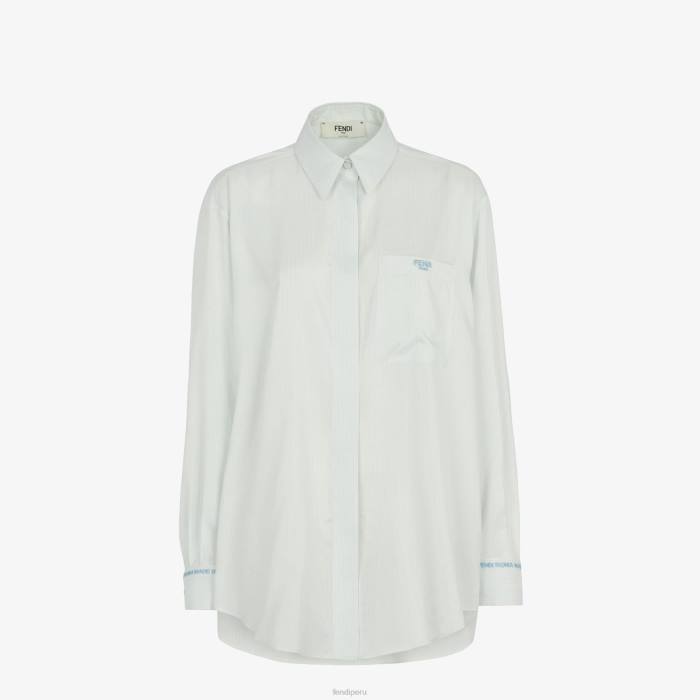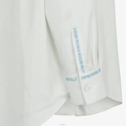 Camisa de manga larga con hombros caídos y bolsillo en el pecho. dobladillo redondeado. cierre de botón cubierto. confección en seda a rayas de color azul claro. adornado con el logo de fendi bordado en el bolsillo del pecho y la inscripción “fendi roma made in italy” en los puños del mismo color.