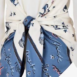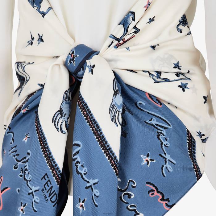 cárdigan con detalle de fular drapeado. hecho de hilo de lana blanca. fular confeccionado en sarga de seda en color azul y blanco, con motivo de astrología fendi estampado por toda la superficie.