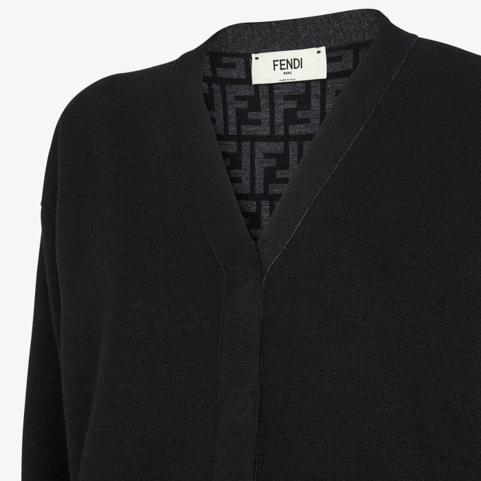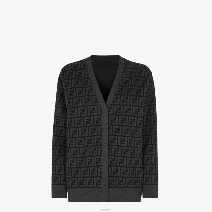 Cárdigan reversible de manga larga y cuello de pico. broche de cierre. Confeccionado en lana negra de punto de doble cara. forro personalizado con motivo ff en jacquard integral en gris y negro.