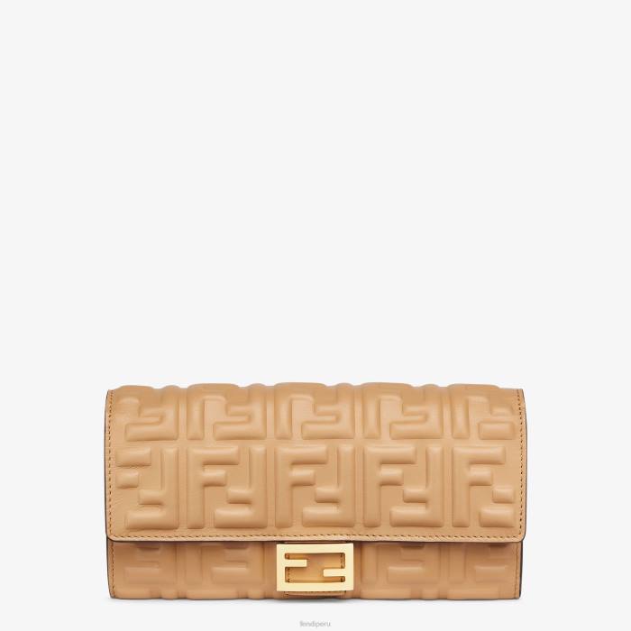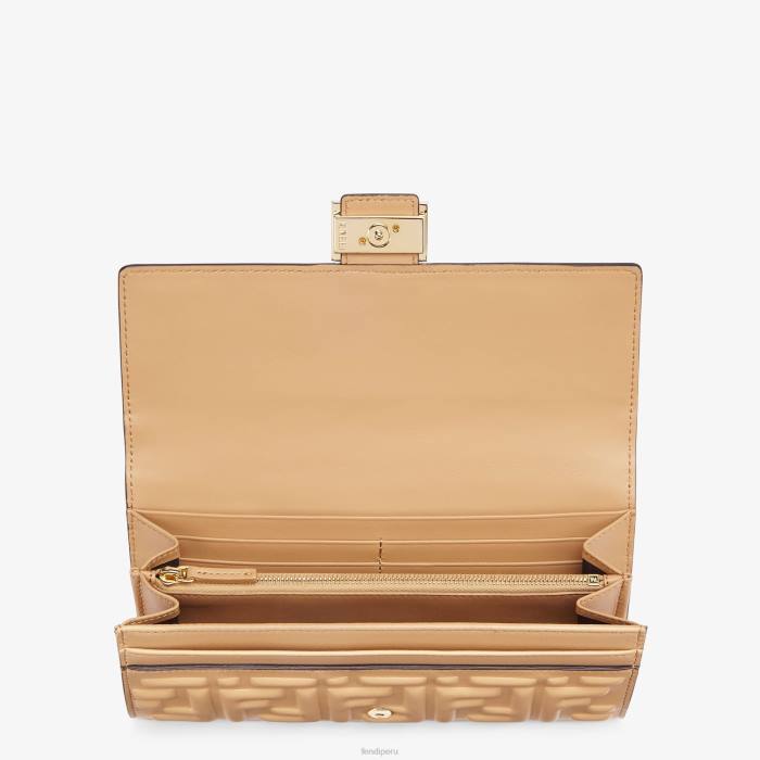 Cartera continental baguette con cierre a presión. espacioso y bien organizado, con dos bolsillos con fuelle, un bolsillo con cremallera, diez ranuras para tarjetas y dos bolsillos laterales planos. Confeccionado en piel napa color beige. adornado con un motivo ff en relieve. artículos de metal con acabado dorado.