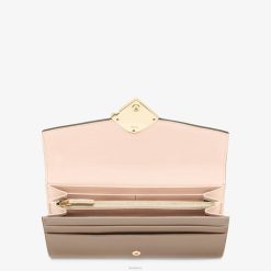 Cartera continental de diamantes ff con cierre a presión. espacioso y bien organizado, con dos bolsillos con fuelle, un bolsillo con cremallera, diez ranuras para tarjetas y bolsillos laterales planos. Confeccionado en piel color gris tórtola, con solapa y detalles en el interior en piel rosa claro. artículos de metal con acabado dorado.