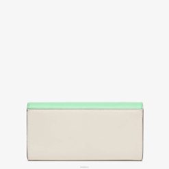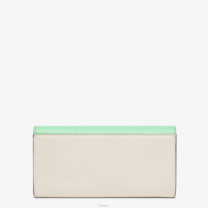 Cartera continental de diamantes ff con solapa con forma geométrica, logo ff en diagonal y fina correa de cadena extraíble. el interior se presenta como una cartera con dos compartimentos reforzados, un bolsillo con cremallera, dos bolsillos planos y diez ranuras para tarjetas. Realizado en piel blanca y verde. artículos de metal con acabado dorado.