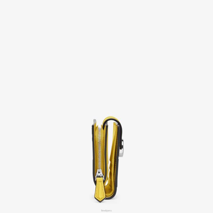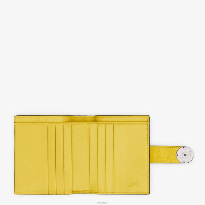 Cartera compacta f is fendi con bolsillo exterior y cierre de cremallera en tres lados. en su interior tiene dos bolsillos planos y ocho ranuras para tarjetas. cierre con botones a presión. Confección en piel crucero martillada de color amarillo. rematado con motivo ff grabado y pintado a mano. Artículos metálicos con acabado en paladio.