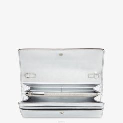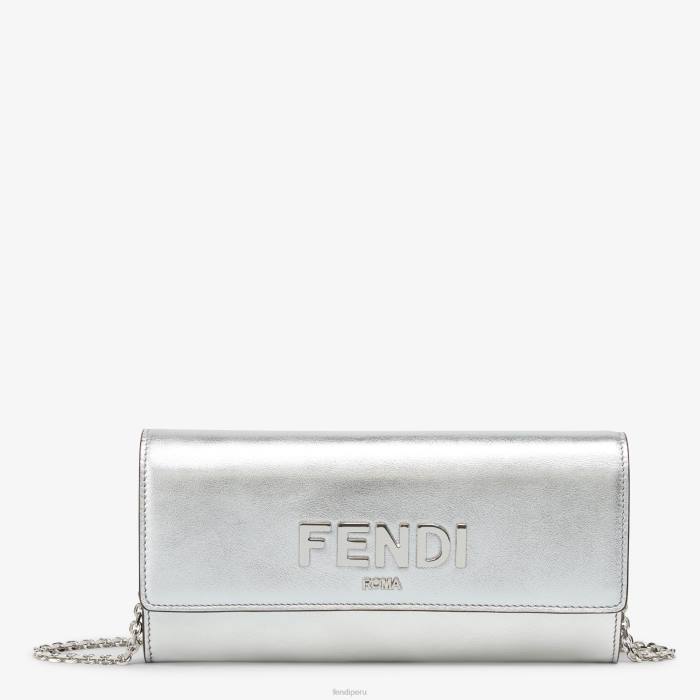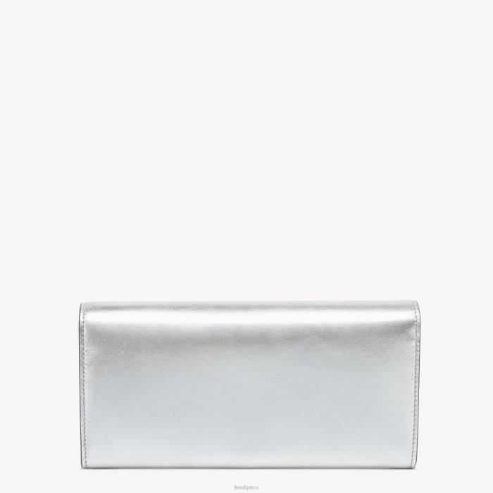 Cartera fendi roma continental con correa de hombro de cadena fina desmontable. el interior se presenta como una cartera con dos compartimentos reforzados, un bolsillo con cremallera, dos bolsillos planos y diez ranuras para tarjetas. Realizado en piel laminada plateada. Letras Fendi Roma y artículos metálicos con acabado en paladio.