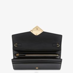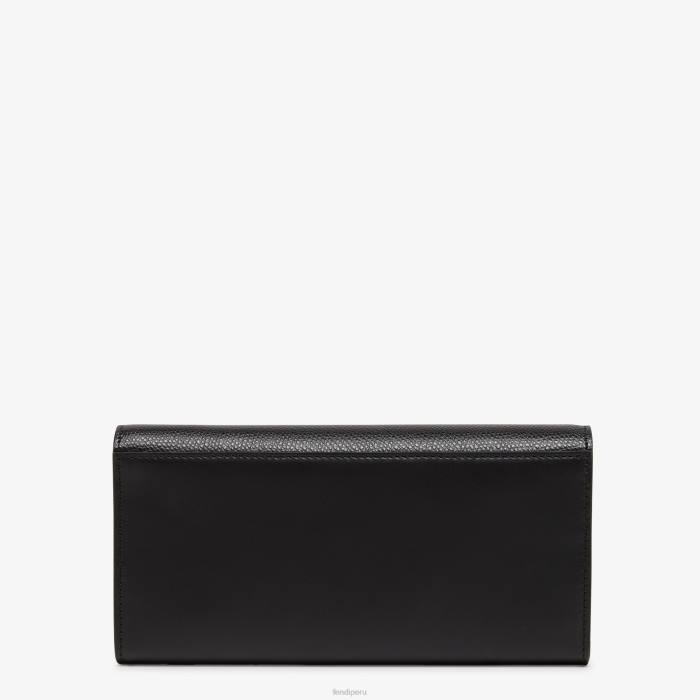 Cartera continental de diamantes ff con solapa con forma geométrica, logo ff en diagonal y fina correa de cadena extraíble. el interior se presenta como una cartera con dos compartimentos reforzados, un bolsillo con cremallera, dos bolsillos planos y diez ranuras para tarjetas. fabricado en cuero negro. artículos de metal con acabado dorado.