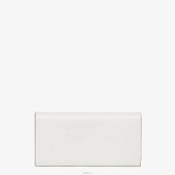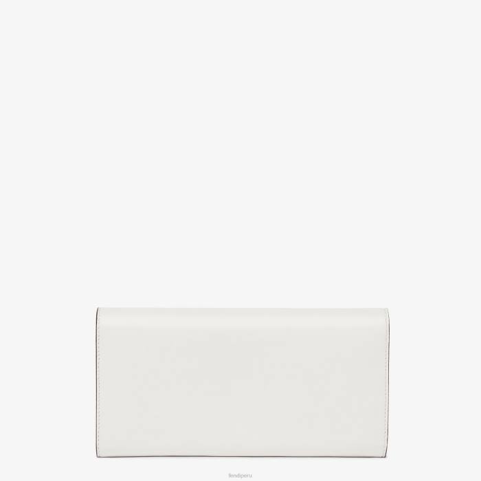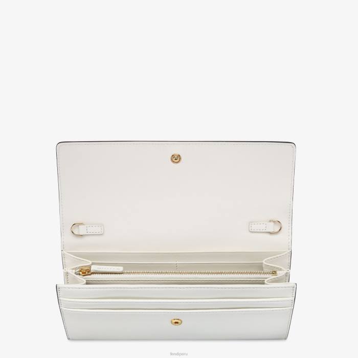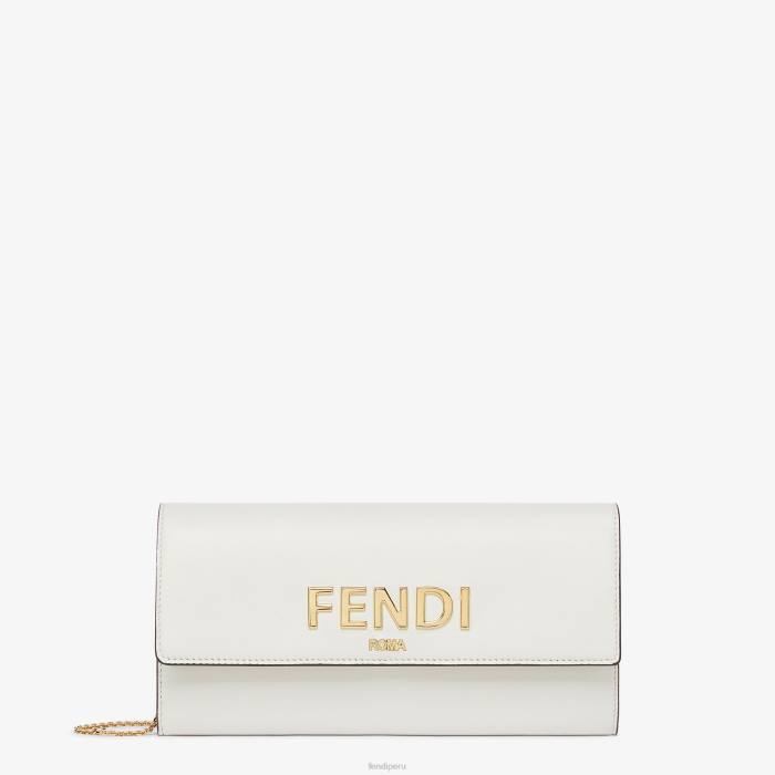Cartera fendi roma continental con cadena corta de metal. el interior cuenta con dos compartimentos reforzados, un bolsillo con cremallera, dos bolsillos planos y diez ranuras para tarjetas. fabricado en cuero blanco. artículos de metal con acabado dorado.