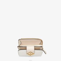 Cartera ff diamantes dividida en seis ranuras para tarjetas, un compartimento para billetes, un bolsillo monedero con cremallera y un bolsillo trasero. fabricado en cuero blanco. Interior y detalles de camelia. artículos de metal con acabado dorado.