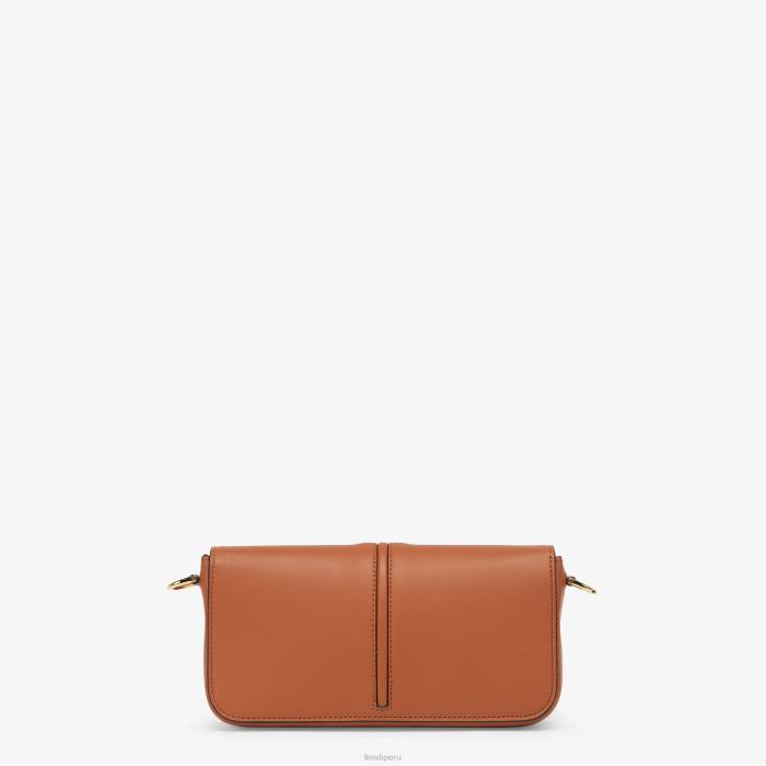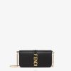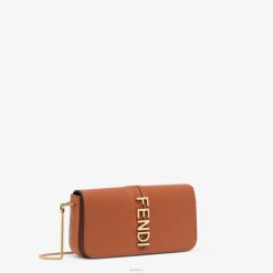 cartera fendigraphy compacta con solapa y letras fendi de metal. con una bolsa interna extraíble con ocho ranuras para tarjetas y un bolsillo con cremallera. Correa de hombro fina y desmontable con cadena. fabricado en cuero marrón. artículos de metal con acabado dorado.