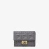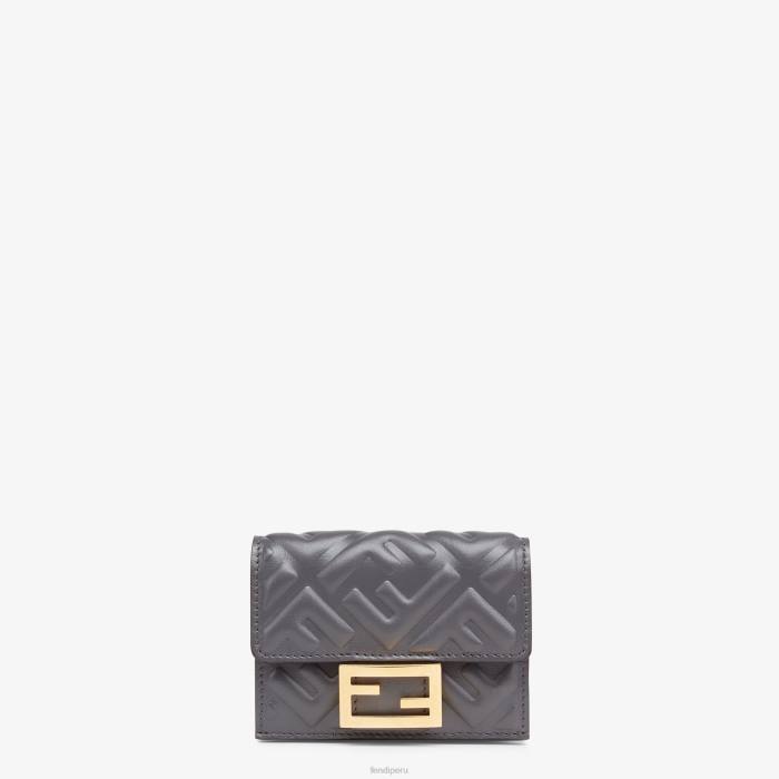 Cartera baguette compacta de tres pliegues con gran compartimento interno para billetes, tres tarjeteros ocultos y un monedero externo con cierre a presión. Confección en napa gris con motivo ff grabado. artículos de metal con acabado dorado.