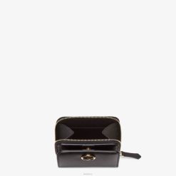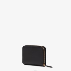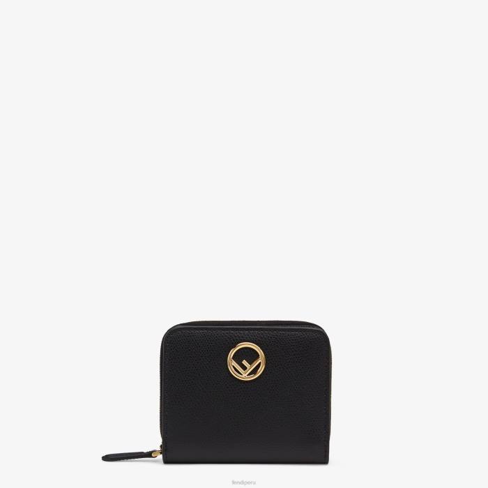 F es una cartera plegable compacta de Fendi. Interior organizado en compartimento para billetes y ranura para tarjetero. Cuenta con un compartimento externo para monedero con cierre de cremallera en tres lados. Confección en piel crucero abatanada negra. artículos de metal con acabado dorado.