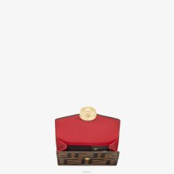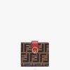 Cartera compacta f is fendi de tres pliegues, con gran compartimento interno para billetes, tres bolsillos tarjeteros ocultos y un monedero externo con cierre de botón de presión. Confección en piel crucero abatanada de color rojo. rematado con motivo ff grabado y pintado a mano. artículos de metal con acabado dorado.