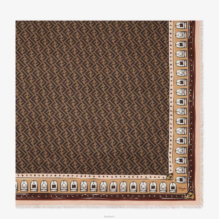 Mantón cuadrado grande confeccionado en una suave mezcla de lana y seda. El estampado atemporal ff enmarca algunos de los elementos más icónicos de la marca. La baguette y el peekaboo están encerrados dentro de pequeños arcos que decoran el borde del diseño. acabado con dobladillos deshilachados a mano.
