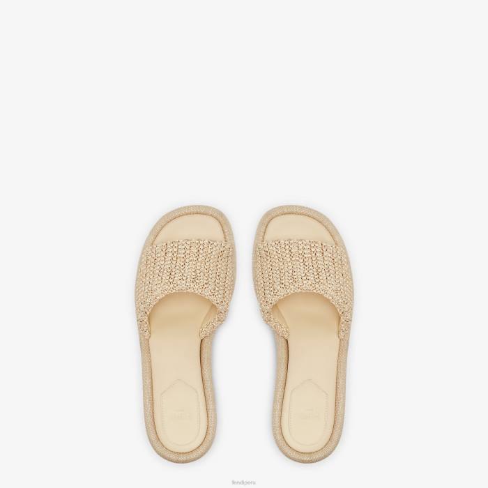 diapositivas de banda ancha. Confección en rafia trenzada de color amarillo pálido. Tacón escultural con motivo baguette ff de metal con acabado dorado.