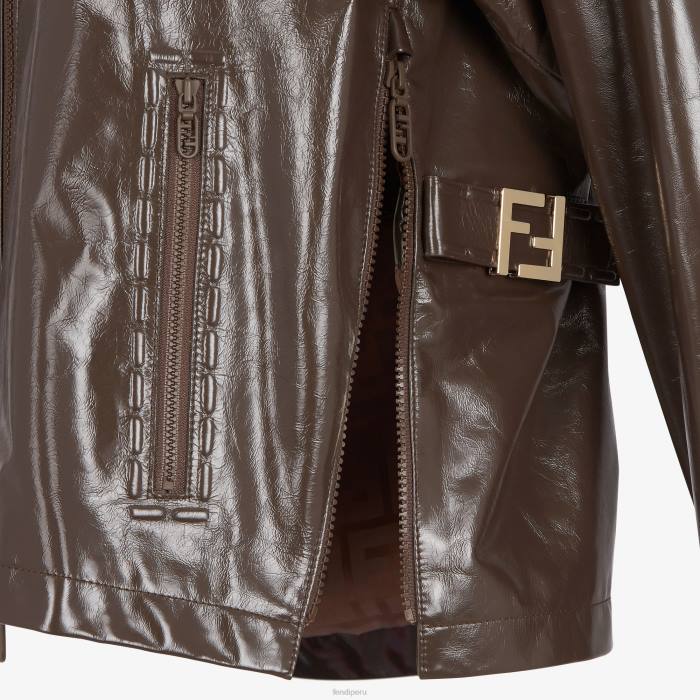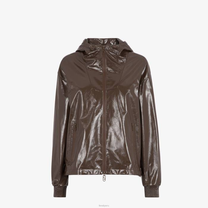 Chaqueta con capucha con cordón y bolsillos laterales con cremallera. cordón interior en la parte trasera de la cintura y puños de canalé. Cierre de cremallera con doble cursor tono sobre tono. Fabricado en suave piel marrón con acabado brillante. correas laterales en la cintura con hebilla ff de metal dorado.
