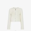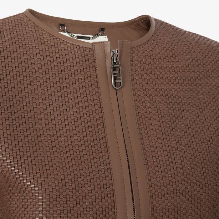 Chaqueta corta de cuello redondo, cierre de cremallera. Mangas largas con aberturas profundas en la parte inferior. elaborado en cuero entretejido de color blanco creado en telares artesanales. adornado con ribetes de cuero liso tono sobre tono.