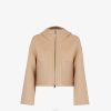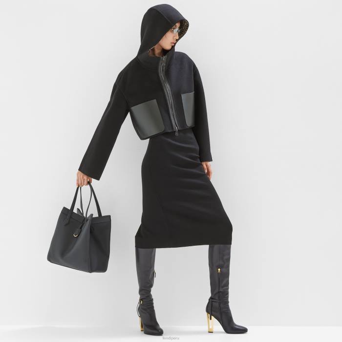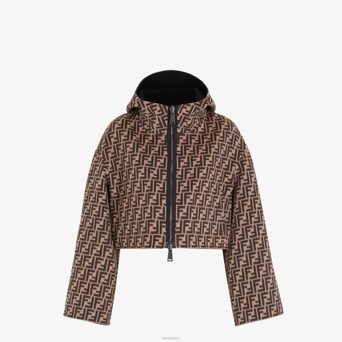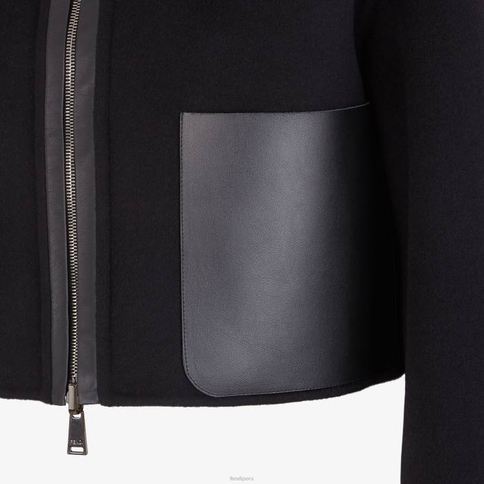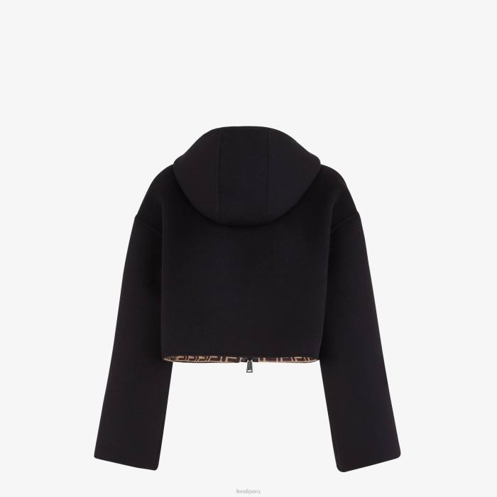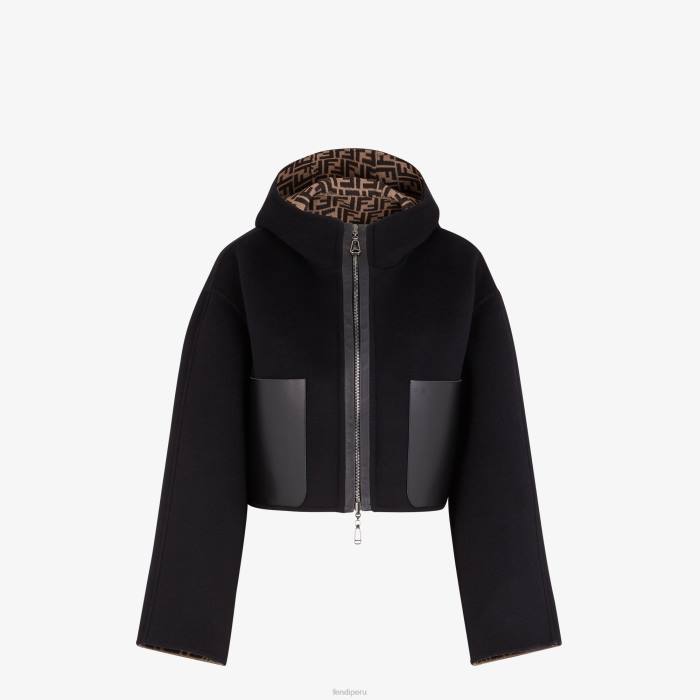 Chaqueta corta reversible con capucha, bolsillos de parche y mangas anchas y escotadas. Cierre de cremallera con doble cursor. confeccionado en tejido de lana negro de doble cara. Bolsillos de piel tono sobre tono. forro personalizado con motivo ff por toda la prenda.