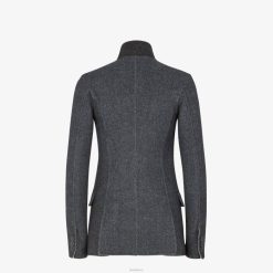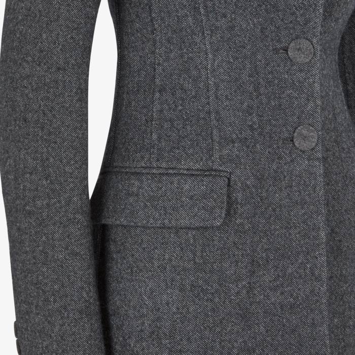 Chaqueta sastre de botonadura sencilla y cintura ajustada. cuello alto, bolsillo en el pecho y bolsillos con solapa. doble abertura en la espalda. Cierre con botones forrados. Confeccionado en lana de doble cara de color gris oscuro con tejido diagonal. cuello de lana gris en un tono ligeramente más oscuro.