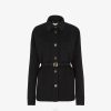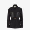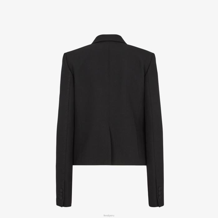 Chaqueta corta de abotonadura simple, cuello con solapa pequeña, manga francesa y abertura central en espalda. Bolsillo en el pecho y bolsillos con solapa en la parte delantera. cerrado con tres botones forrados. confeccionado en lana grain de poudre negra. acabado con micro letras fendi roma made in italy bordadas en tono a juego en la parte posterior de la manga izquierda.
