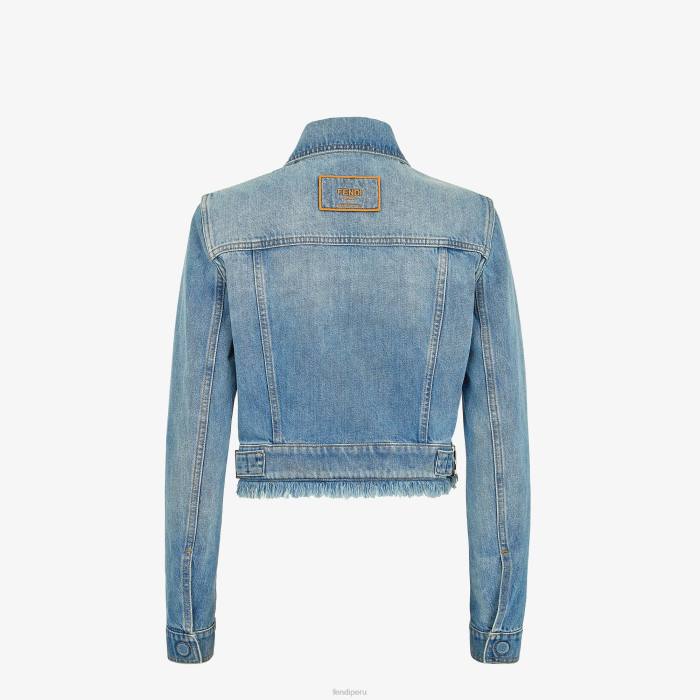Chaqueta cropped con cuello camisero, confeccionada en denim de algodón lavado en color azul claro. adornado con borde con flecos y detalle de cuero marrón.