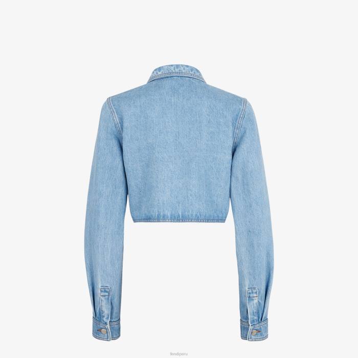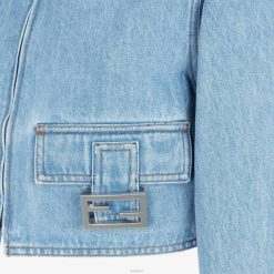 Chaqueta corta con cuello en punta y bolsillos con solapa en el pecho. cierre de cremallera. Confeccionado en denim azul ligeramente descolorido. adornado con costuras en contraste y hebilla baguette ff de metal con acabado paladio en los bolsillos. forro personalizado con motivo ff.