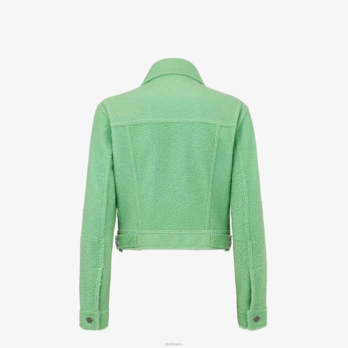 Chaqueta corta con cuello camisero y bolsillos en el pecho. Mangas largas ligeramente caídas. cierre de cremallera frontal con tirador de cremallera Fendi O’lock. Confección en borrego extrafino verde neón de textura suave y ligera.